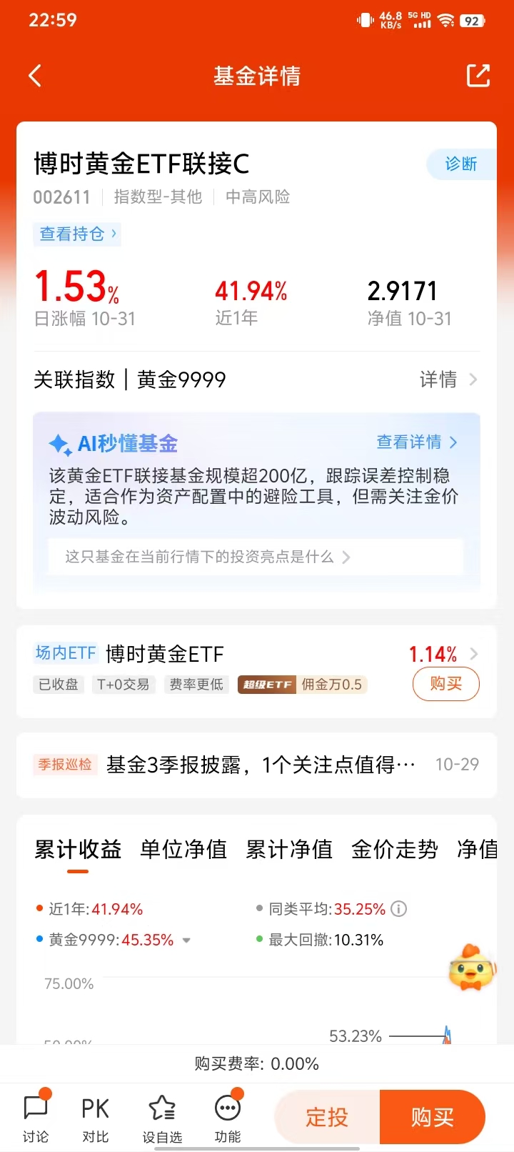 成本低廉,透明度高:与实物黄金投资相比,博时黄金ETF联接基金的管理费率、托管费率均较低,且无申购费、持有一定时间后免赎回费。这意味着投资者在享受我的增值潜力的同时,无需承担高昂的交易成本。此外,基金的投资策略透明度高,投资者可以清晰了解基金的投资方向和持仓情况。