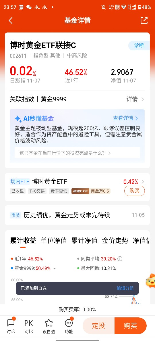 在众多黄金投资工具中,我最终选择博时黄金ETF联接C,核心在于其完美适配普通投资者的配置需求。首先是跟踪精准且成本可控,这只基金紧密跟踪上海金AU9999价格,日均跟踪偏离度小于0.6%,年跟踪误差控制在6%以内,能精准捕捉金价波动收益,避免了主动管理型基金的风格漂移风险。同时其费率优势显著,管理费仅0.5%、托管费0.1%,第三方平台常免申购费,持有30天以上还可免赎回费,长期持有成本远低于实物黄金的存储与变现成本。其次是门槛低、流动性强,无需股票账户,通过支付宝、银行APP等平台10元即可起投,支持定投和T+1赎回,对于资金量不大、追求灵活操作的普通投资者来说,无疑是参与黄金市场的最优路径。此外,基金规模超15亿元(2025年三季度数据),日均成交额活跃,资金进出便捷,不会出现大额赎回受限的情况,进一步提升了投资体验。