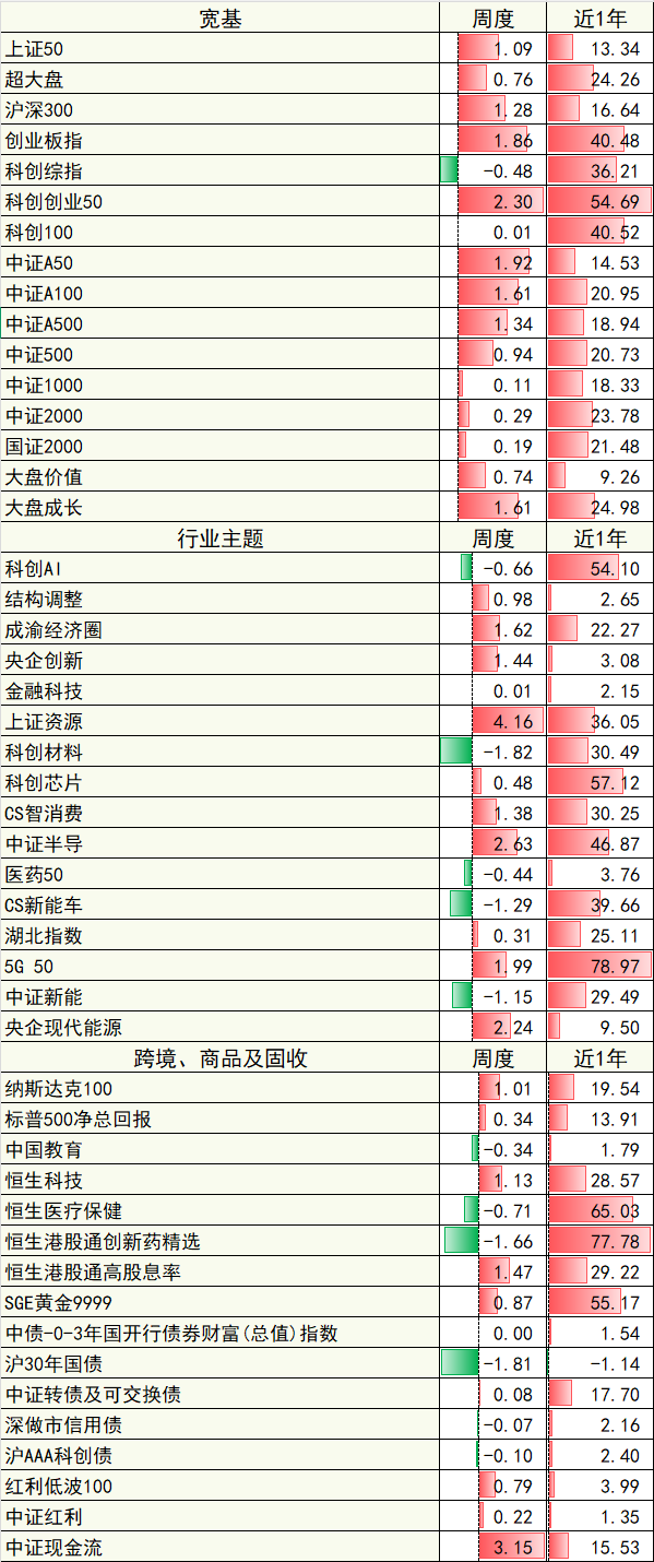 国内:A股主要指数上涨,日均成交额1.68万亿(-2.38%),风格上大中盘优于小盘。上证50指数涨1.09%,沪深300指数涨1.28%;创业板指涨1.86%,科创综指跌0.48%;有色金属、通信、国防军工、机械设备和非银金融涨幅居前,分别上涨5.35%、3.69%、2.82%、2.77%、2.27%;纺织服饰、计算机、食品饮料、美容护理、房地产涨幅靠后。