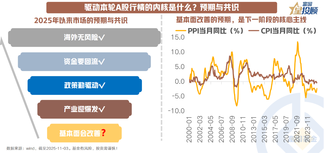 本轮A股行情的内核驱动力,已从传统的盈利增长转向更深层次的“预期重构”与“共识凝聚”。这是市场认知层面的一次根本性转变,也是推动指数稳步上行的深层逻辑。2025年以来市场的预期和共识主要集中在5个层面,即海外无风险、资金要回流、政策勤驱动、产业迎爆发,基本面会改善。从当前的市场去看,前四个逻辑或多或少的已经被验证,且持续的影响着市场。而市场对于基本面改善的预期,更多的放在了2026年二季度验证。所以,当前来看基本面改善的预期和共识无法在短期内证实或证伪,下一阶段的核心主线是基本面的改善实质,特别是CPI和PPI的由负转正。