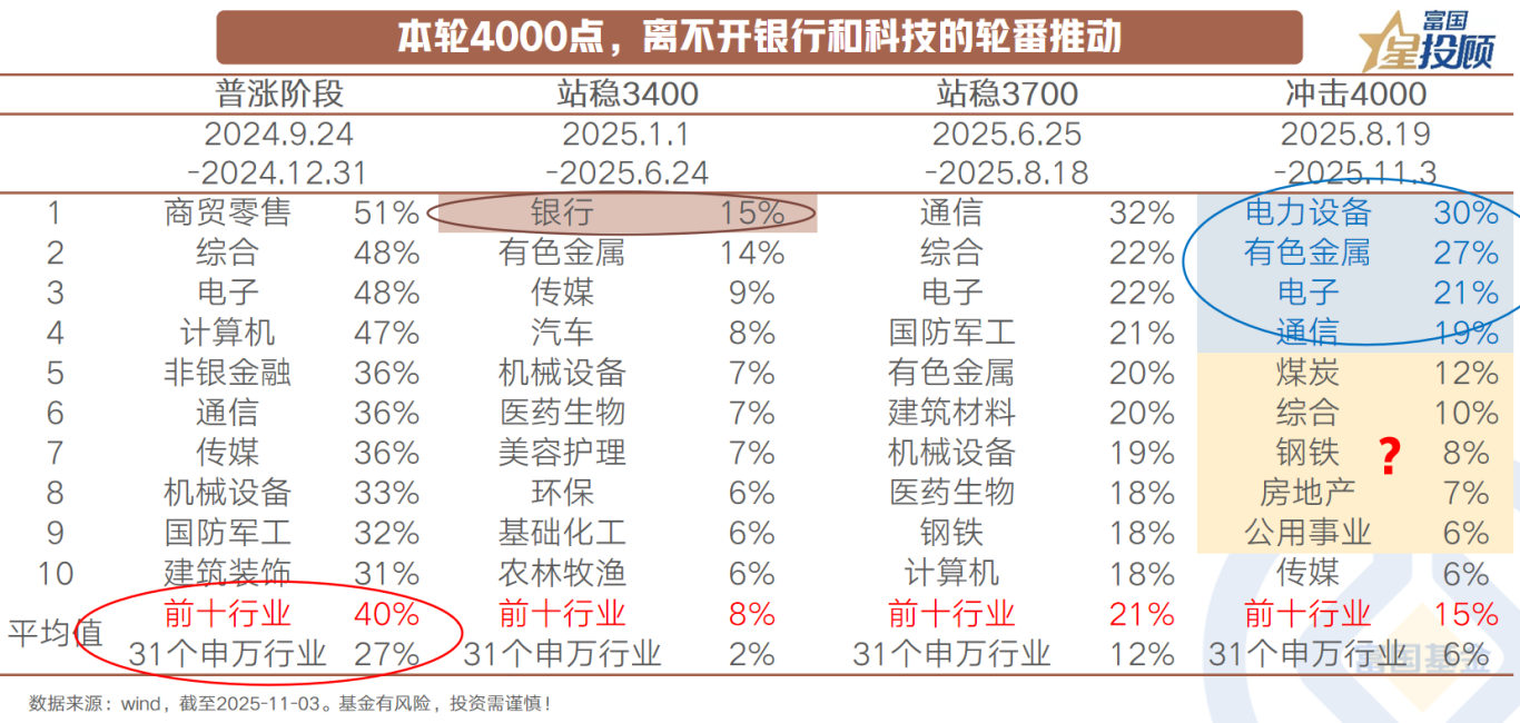 本轮A股冲击4000点的征程,呈现出清晰的“双轮驱动”格局——银行与科技交替发力,共同书写了一场节奏分明、基础扎实的上涨行情。行情启动的标志性事件是“924”政策拐点,市场情绪被点燃后呈现出普涨的格局。但随后市场在3300-3400来回震荡,并遭遇了中美贸易摩擦的冲击,在此阶段银行稳健发力,成为市场站上3400点的“压舱石”。随着风险偏好的提升,以人工只能为代表的科技,以出海驱动的医药,以反内卷为主线的有色金属全面爆发,推动指数站上3700点。但在市场冲击4000点的阶段,市场再次出现了分化:一方面,高波动的科技板块继续承担冲锋角色,但过程相当曲折;另一方面,部分周期板块出现补涨行情,风格转换的讨论也多了起来。这场银行搭台、科技唱戏、周期助阵的协同作战,使得A股4000点之路相较历史显得更为稳健与健康。