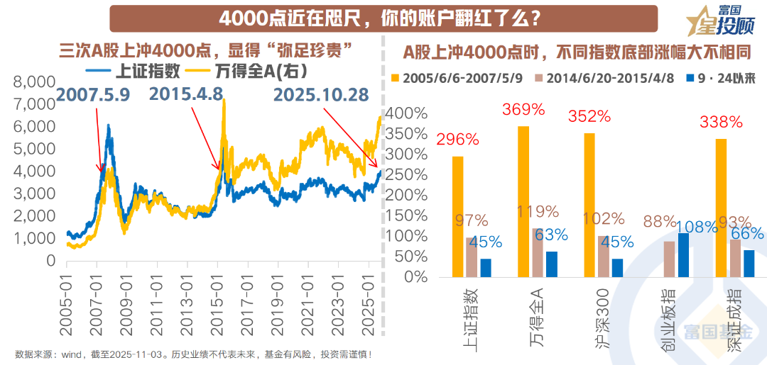 回顾历史,4000点并不常见,上证指数只出现过3次牛市中的4000点,从2007年的狂飙,到2015年的跌宕,再到如今的稳健上行,都显得如此的弥足珍贵。这也导致4000点,成为了A股市场重要的心里关口。但在指数冲关的背后,每一次的行情都是逻辑的深刻变化,2007年是宏观经济的一路长虹,2015年则是“大众创业、万众创新”引领的模式创新与杠杆驱动,而2025年以来的核心驱动则是产业趋势、政策拐点,以及资金共振。此外,本来行行情的涨幅已不算低,创业板指数翻倍,上证指数也自底部上涨了45%。但相对于2007年和2015年底部到4000点的涨幅,本轮行情似乎仍处于相对早期的阶段。