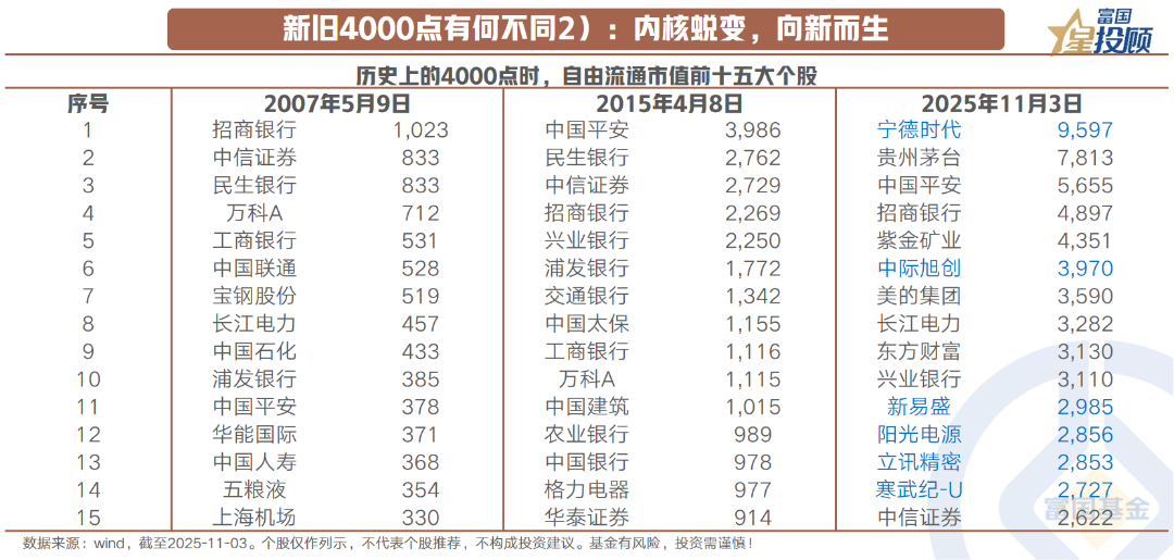 如果说指数点位是市场的“面子”,那么市值结构就是决定市场的“里子”。与2007年和2015年两次冲击4000点时相比,当前A股的内核已然发生了一场深刻的“新陈代谢”。2007年与2015年,A股市场自由流通数值前十五大的公司,主要集中在金融、石油石化,以及传统地产的方向,这一时代由信贷扩张、固定资产投资和重工业化所驱动。然而,时移世易。今天市场在4000点附近,领航市场的旗舰已经变化,一批代表“新质生产力”的科技龙头,绘制了崭新的市值版图,这是”旧经济“向”新动能“切换的实证。