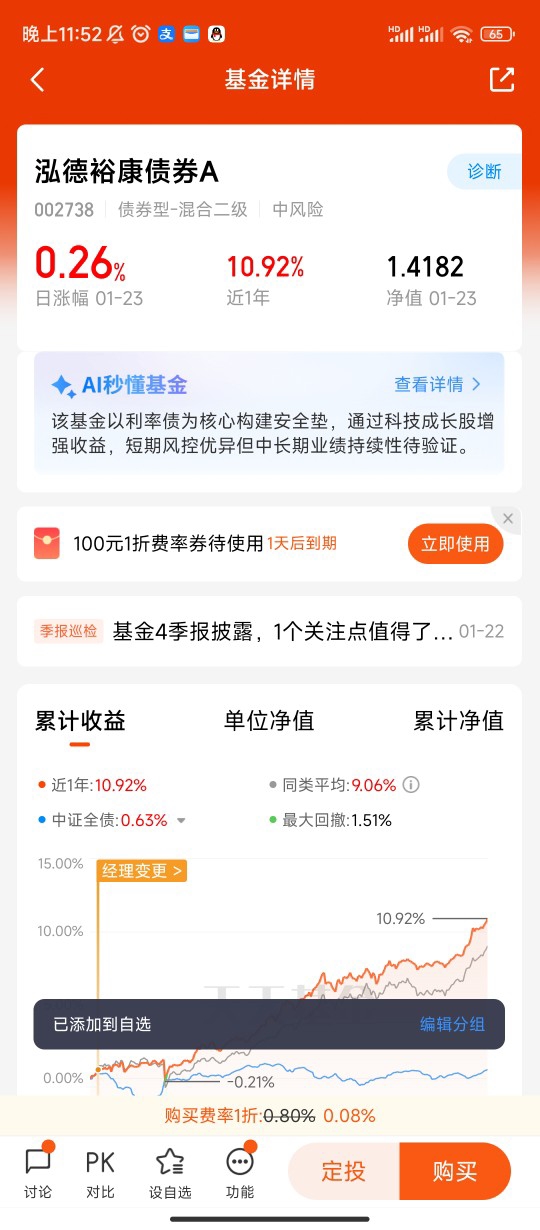 再聊聊2026年债基该怎么投,其实关键就抓3点:一是选对类型,像泓德裕康这种“固收+”比纯债基金收益弹性大,又比股票基金风险低,适合大多数人;二是看重回撤控制,2026年债市波动会比之前大,这只基金近一年最大回撤才0.3%,持有起来不用提心吊胆,比那些动辄回撤好几 percent 的基金安心多了;三是选对持有方式,C类份额0申购费,持有180天还免赎回费,很适合定投,平时急用钱也能随时取,比定期存款灵活。