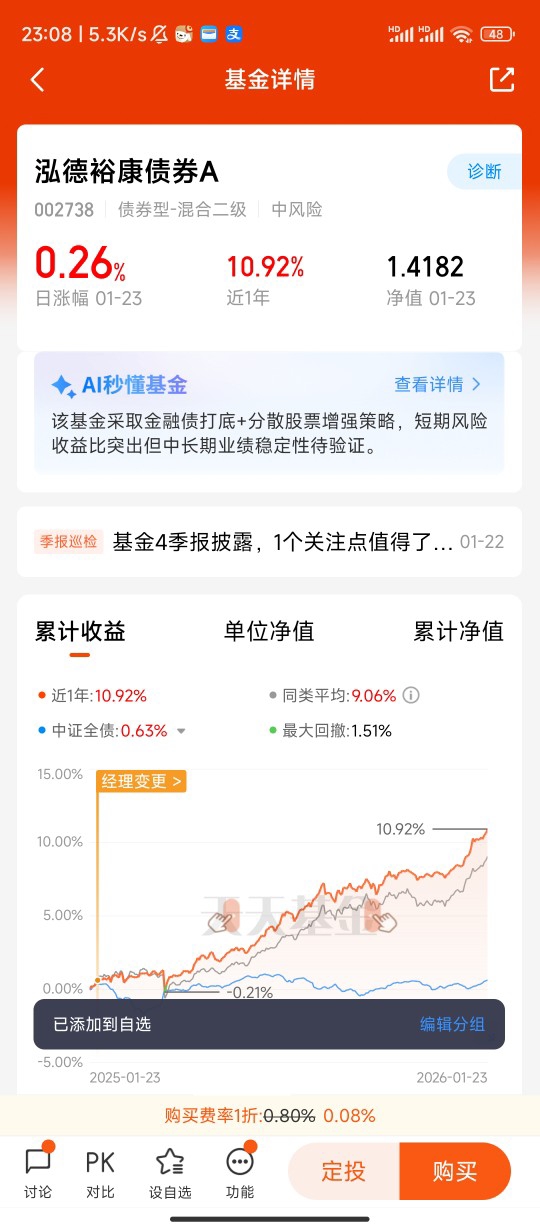 投这只基金我也不打算频繁操作,就是长期持有为主,偶尔看看市场节奏做小幅度调整。毕竟2026年做债基投资,拼的不是赚快钱,而是风控和灵活度,泓德裕康的固收增强模式,刚好做到了“债底稳、增强巧”,既不用像纯债那样忍受低收益,也不用像偏股基金那样担大风险,特别适合我这种想赚稳健收益,又不想花太多精力盯盘的普通投资者。2026年就跟着泓德裕康,把固收增强这条路走稳,不求大赚但求稳稳的增值。@泓德基金