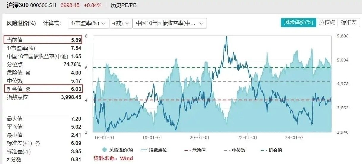 (3)资产配置灵活:固收+基金的投资策略灵活,可以根据市场情况及时调整资产配置比例。当前A股(沪深300指数)收益率为7.54%,10年期国债收益率1.65%,风险溢价率(股债利差)当前值为5.89%。按照FED估值模型,10年风险溢价率中位数5.17%、危险值4.00、机会值6.03%;当前值5.89%接近机会值6.03%,A股市场当前仍处于估值低位。