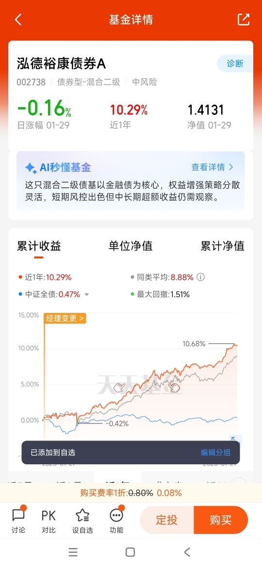 这里重点介绍一只今年表现比较亮眼的好基——$泓德裕康债券A$ 是一种将固定收益类投资和股票类投资相结合的混合型基金。这种固收+基金以固收资产作为底仓,辅以一定仓位的风险资产力争增厚收益,一般采取“固收+股票”、“固收+可转债”、“固收+股票+可转债”等多元配置方式。股票作为权益资产,具有较高收益潜力的同时,波动也较大;可转债兼具股性债性,在一定条件下可转换为股票,风险收益水平高于纯债资产。以下是固收+基金的优点和如何选购适合的固收+基金的指标: