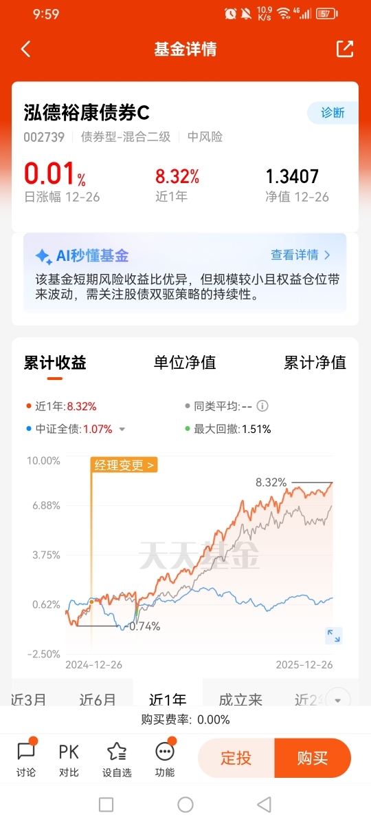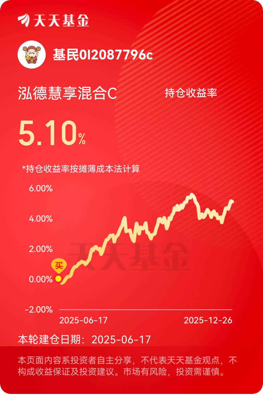 虽然我目前还没有正式持有这只基金,但我早已对它的实力深信不疑,创建定投计划就是我看好它的最好证明。2026年,我会坚定执行定投和加仓的策略,秉持长期持有的投资心态,与泓德裕康债券C携手同行。我相信,这只实力过硬的基金,一定不会辜负每一位投资者的信任与坚守,在新的一年里继续乘风破浪,再创佳绩,为我们带来更多的惊喜和回报!@泓德基金