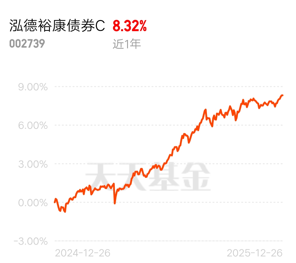 再有三个交易日,A股就将进入2026年,目前,国内处于降息通道中,也就是低利率,甚至未来有可能零利率或者负利率。这种情况我认为固收+产品我们可以考虑。比如混合债基,有很少比例投资股票,大部分比例投资债券,可以稳定的跑赢银行定存利息。比如$泓德裕康债券C$ 今年以来已上涨8.41%,不出意外的话今年收益率达到8%是大概率。成立至今历史回报率49.41%。成立至今9年多,平均每年单利达5个点左右,确定比银行定存利息高。@泓德基金