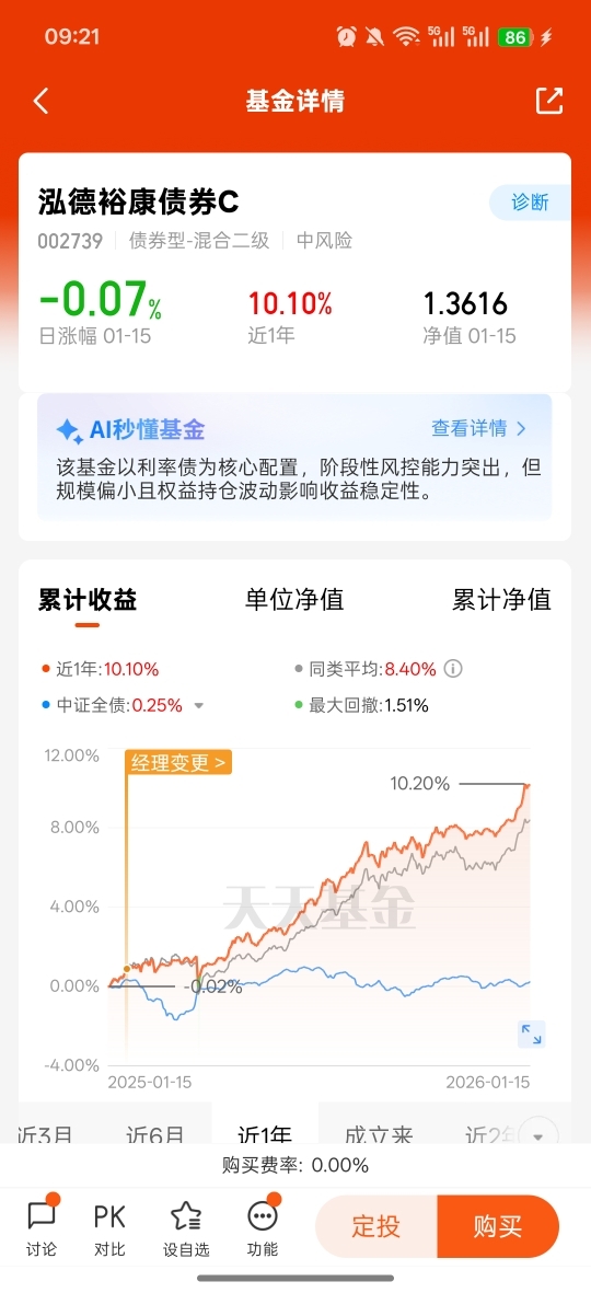 泓德裕康债券是一款固收加产品,收益稳波动小,适合作为底仓配置,降低震荡:1.存款