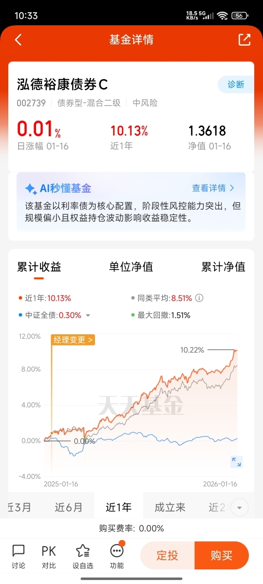 差异化风险匹配:作为中风险等级产品,泓德裕康适合不同风险偏好的投资者:保守型投资者可将其作为核心持仓,搭配短债与货币基金;稳健型投资者可适当提升配置比例;进取型投资者则可将其作为“压舱石”,搭配权益类产品。