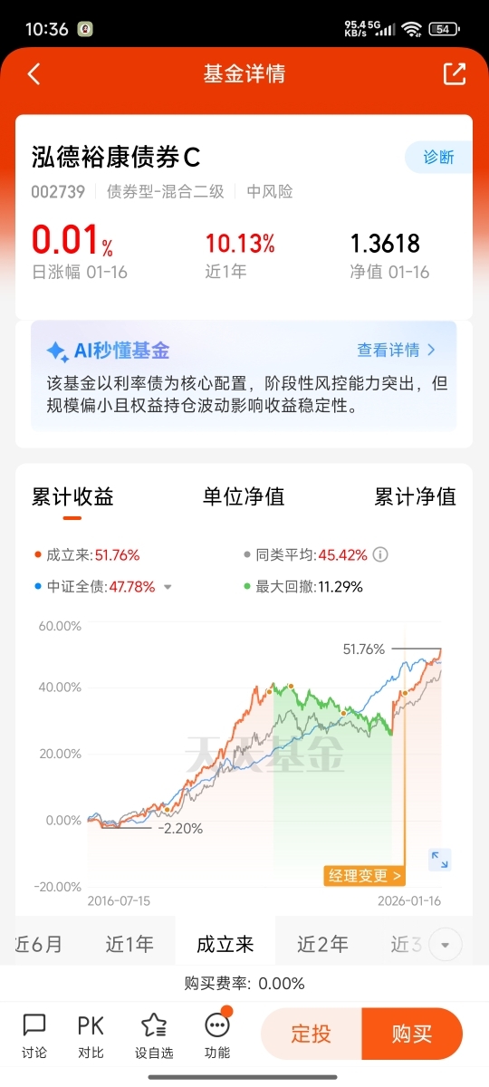 - 收益爆发力:截至2026年1月15日,近1年涨幅10.10%,近2年15.95%,远超同类平均的6.70%和9.96%!要知道纯债基金年化大多在3%-4%,它能做到两位数收益,还能保持12个月持续飘红(全市场同类仅14只做到),稀缺性拉满 ~