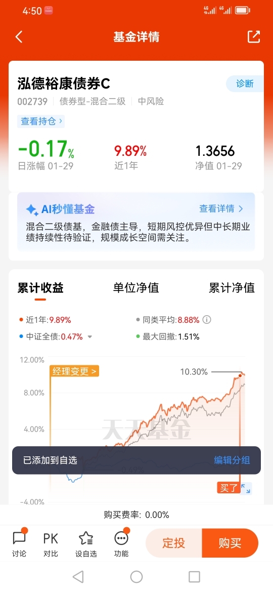 因此我选择了泓德裕康债券C(002739),因为泓德基金在投资领域相当专业。@泓德基金