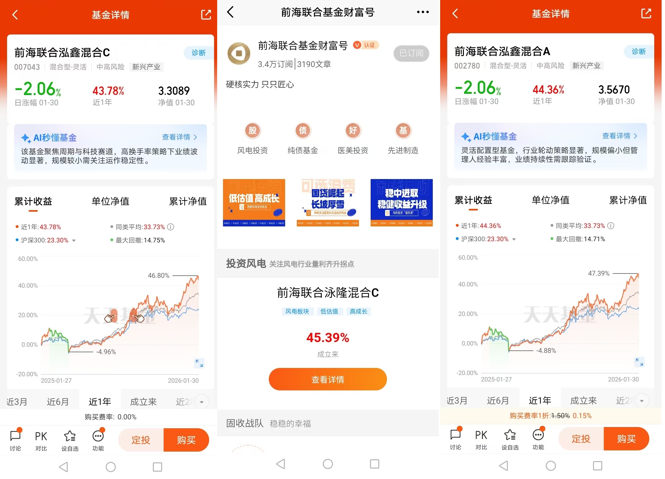 转机是去年冬天,小区里的老邻居张阿姨跟我聊天,说她投了前海联合泓鑫混合型基金A/C,一年下来赚了不少,不仅没亏本金,收益还比银行存款高好几倍。我一开始还不信,反复问她“真的不会亏吗”,张阿姨笑着说,这只基金不盲目跟风,既买了人工智能、新能源这些能赚钱的新科技公司,又买了银行、矿产这些稳当的老产业股票,就算市场跌了,稳当的板块也能撑着,波动不大。她还拿出自己的基金持仓截图给我看,去年四季度这只基金的净值增长率有3.02%,利润也有107.26万元,不是那种虚头巴脑的噱头。