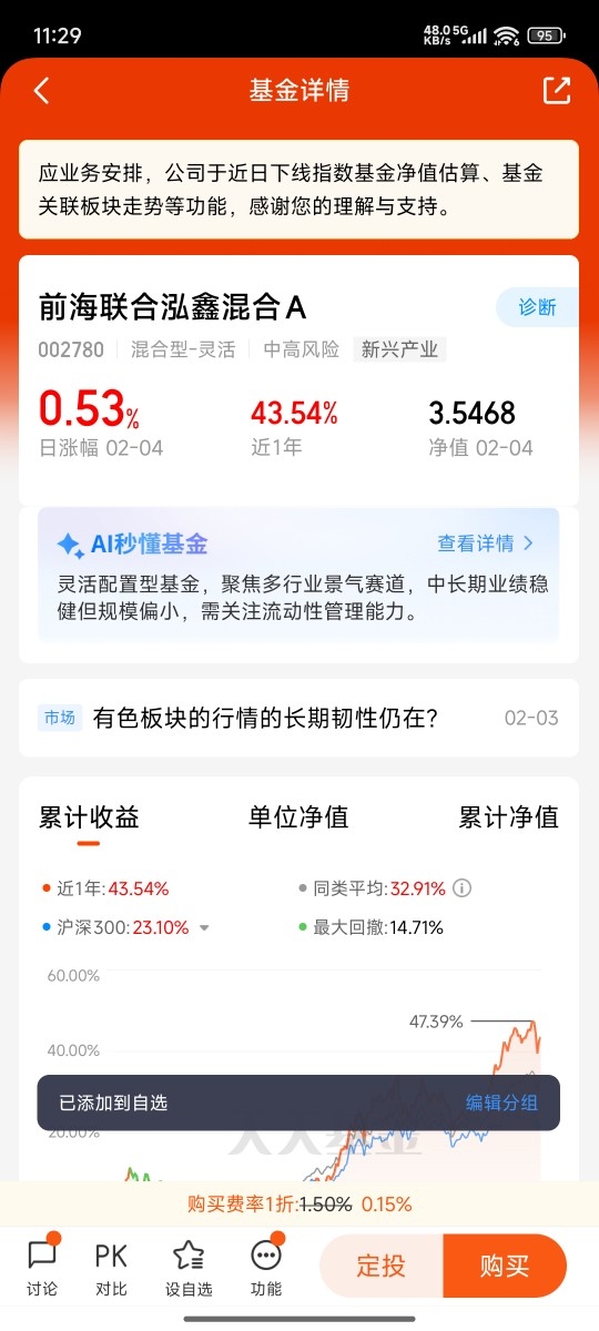 - 费率方面:A类份额申购费1.5%,但平台普遍打1折,仅0.15%,长期持有无销售服务费,管理费1.5%/年、托管费0.25%/年,处于行业中等水平,对刚毕业的我们来说,每一分钱都能花在刀刃上;