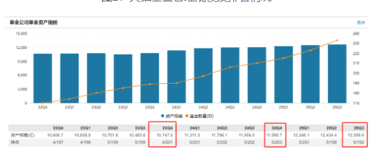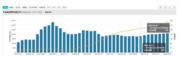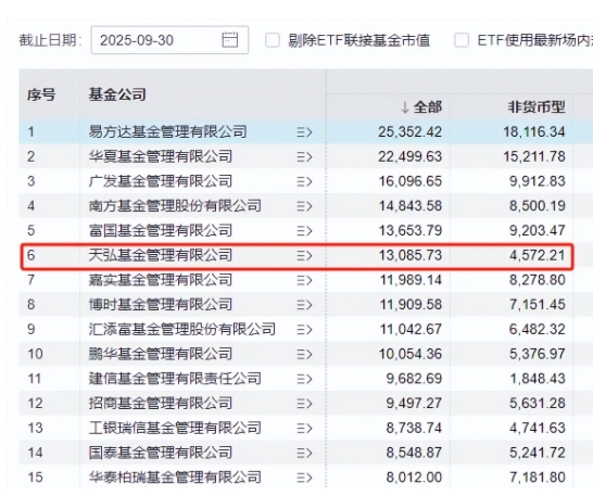 2025年三季度,天弘基金管理规模业内排名第6;