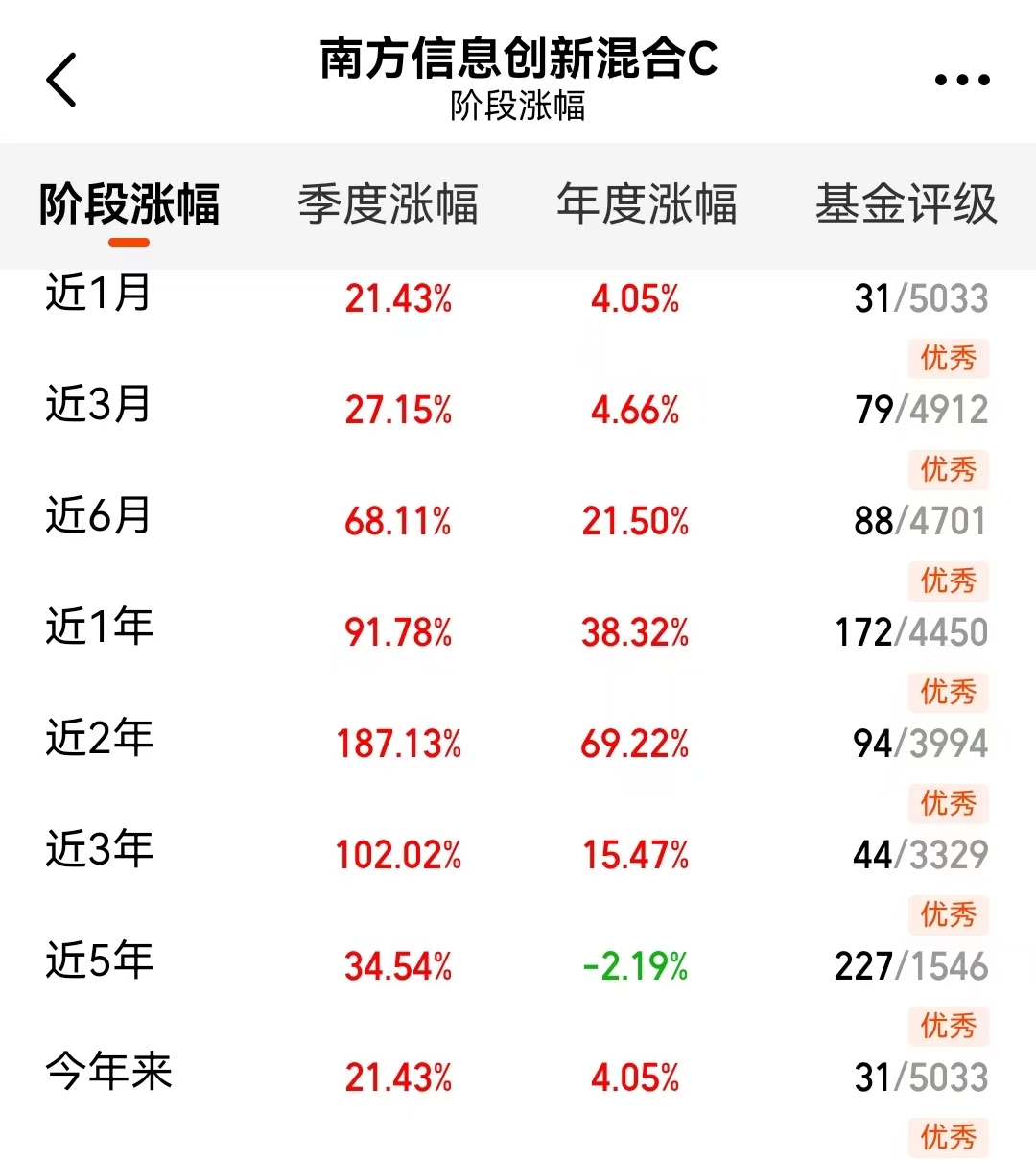 我选择$南方信息创新混合C$(007491)的理由很直接,就是因为它最近涨得好,近一个月21%,近一年91%,数据不会骗人。趁着前两天回调,我买了点当作布局。核心就是看好半导体,这个行业有国产替代这个长久的故事可以讲,而且行业本身也到了周期反转的节点,预计明年会有不错的盈利表现。现在这个时点买入,我感觉并不算晚,行情可能才刚起来,热度也还在。这种能紧密跟踪并抓住行业趋势的基金,我觉得是当前行情下不错的选择。#2025超额关键词#