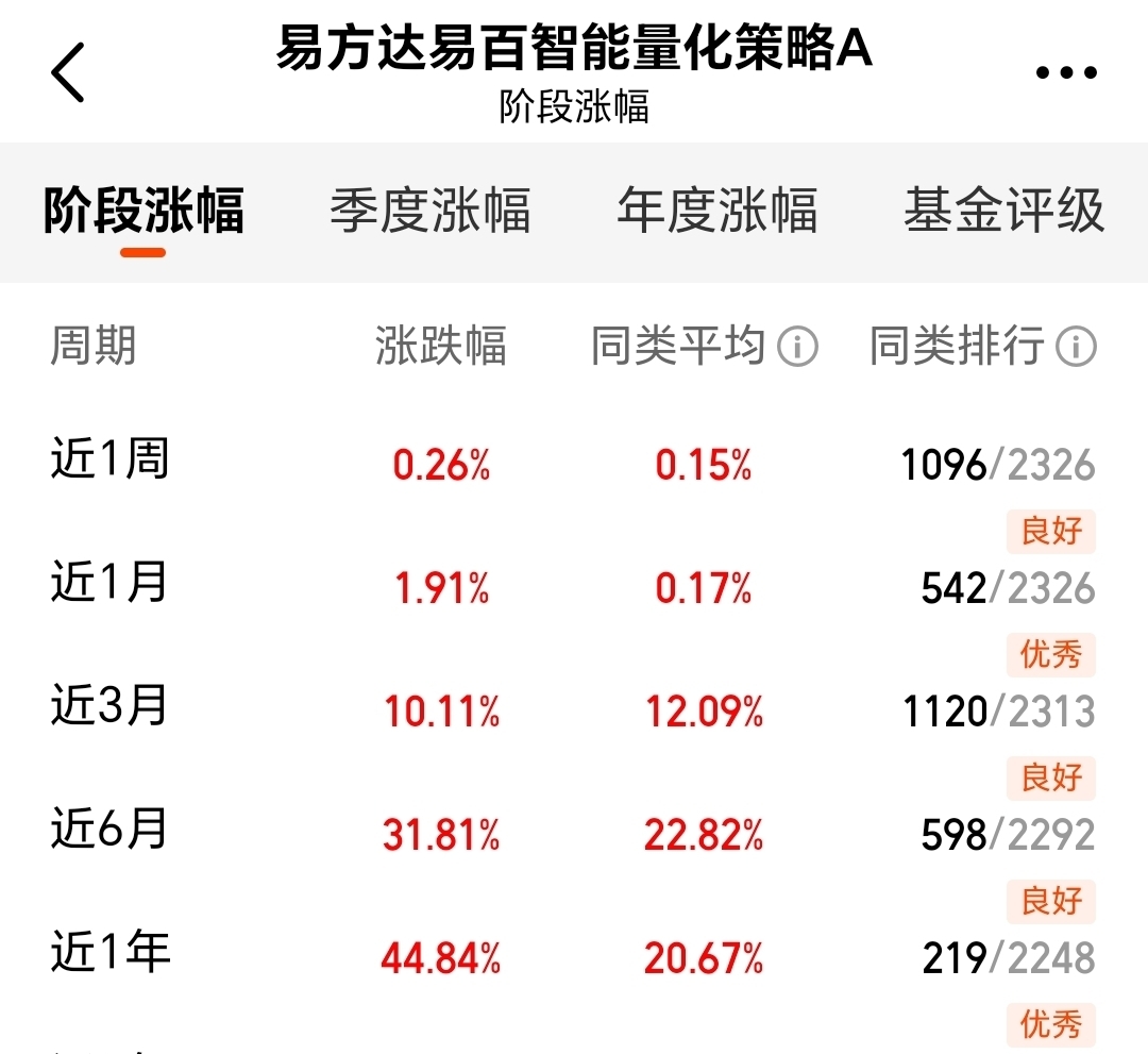 $易方达易百智能量化策略A$ 长期跑赢大盘,牛市更能放大收益。在当前行情中,其高频调仓优势尽显,无惧轮动持续跑赢市场。