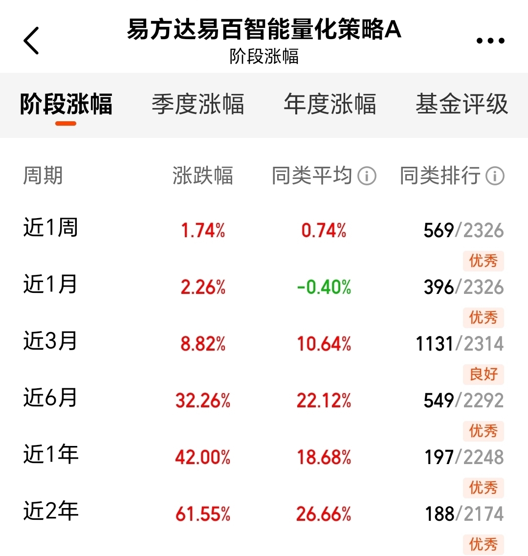 $易方达易百智能量化策略A$ 凭借优质策略长期跑赢大盘,牛市更能放大收益,近3个月涨8.82%、近一年涨42%,成绩远超同类。