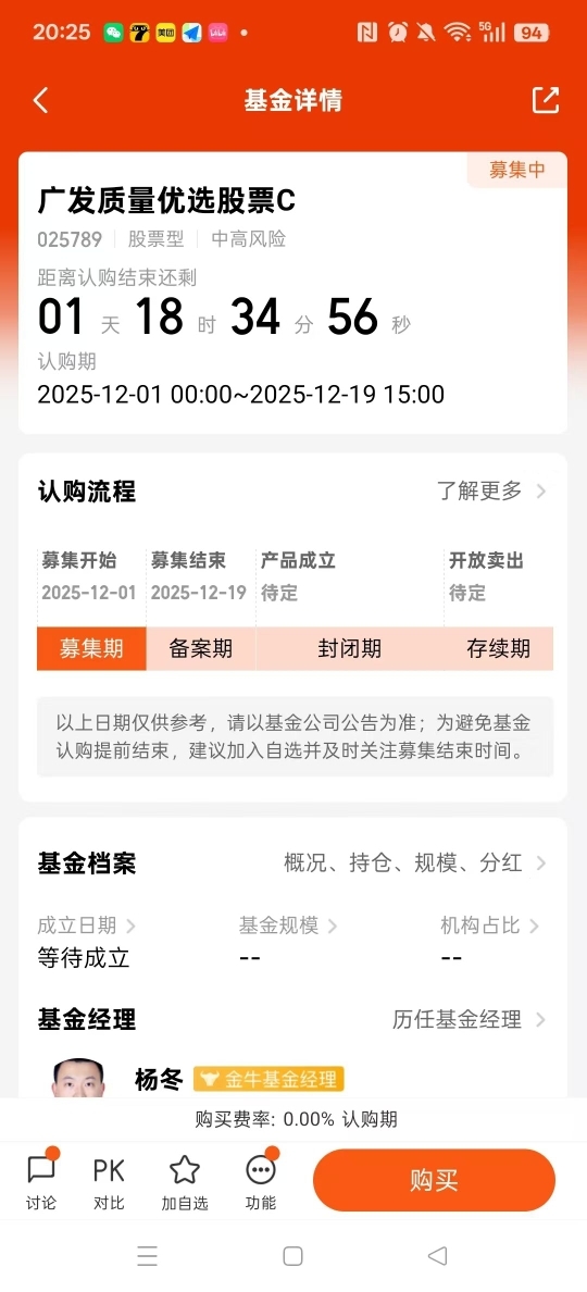 今天涨了两个多点,很惊喜了,杨经理这抓机会的能力还是可以,刚好刷到他有一只新基广发质量优选还在募集,跟着上车了$广发质量优选股票C$