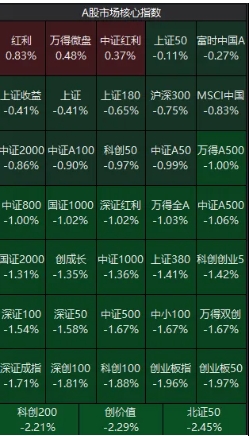 A股核心指数方面,除了红利和微盘股微红外,其他指数全是绿的。
