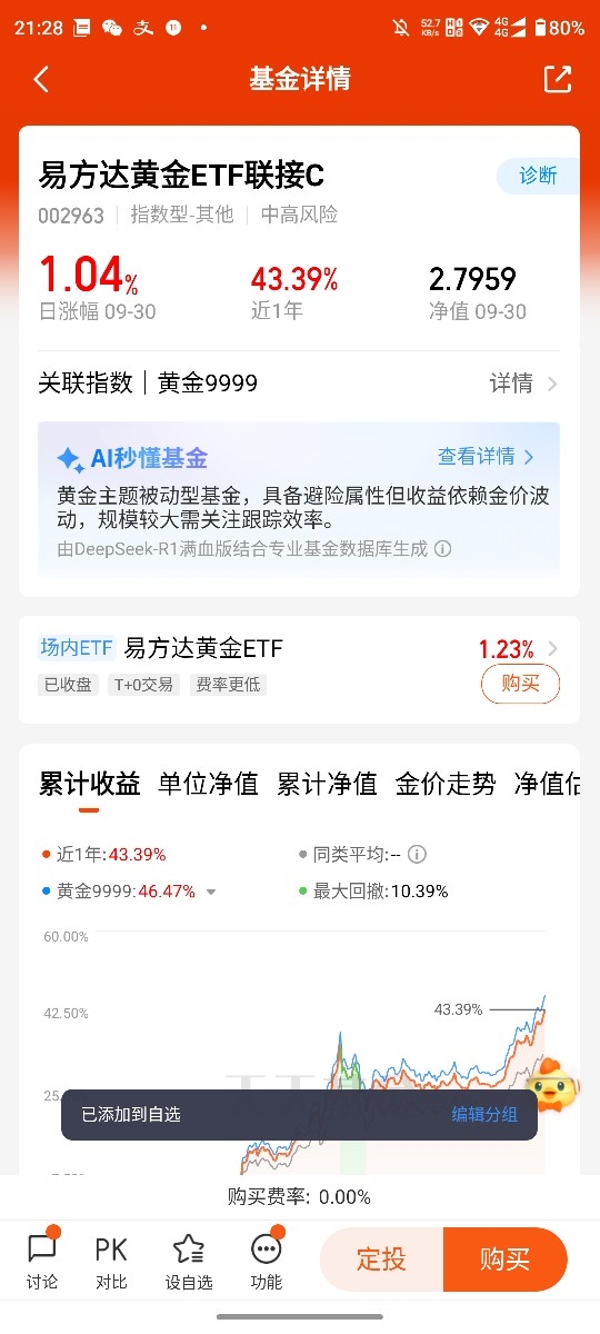 我是陷阱派,我看好$易方达黄金ETF联接C$近期可以考虑将部分资金从易方达黄金E