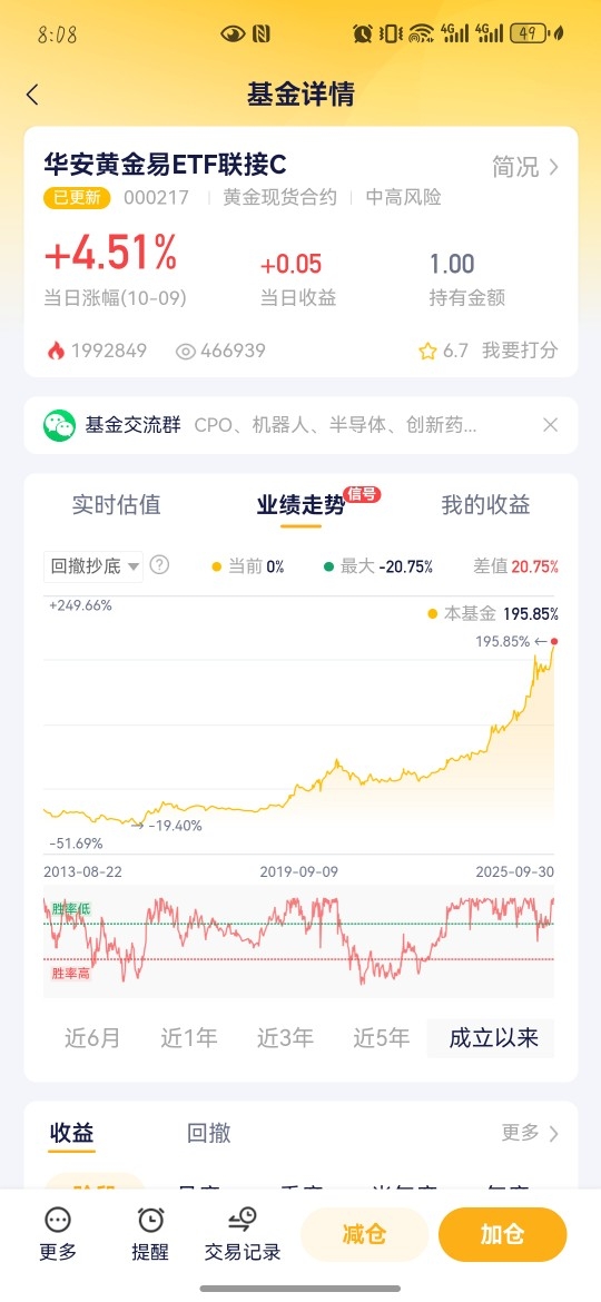 今儿跟同事吃饭,他炫耀最近收益:“我那黄金基金,近一年涨了小45%!”我一问,好家伙,也是华安这只!我赶紧翻自己账户,可不嘛,去年这时候投的5万,现在都快7万2了。他说关键这玩意儿“不挑人”——不懂K线、不会看财报也能买,反正金价涨它就涨。我深以为然!之前我也想过买金条,但放家里怕丢,放银行保管费又贵;买纸黄金吧,还得专门开账户。华安这个直接绑定基金账户,手机操作,赎回也能快速到账,平时该上班上班,完全不影响。现在黄金这波行情还没走完,想跟着喝口汤的,真可以看看华安,毕竟老持有户都懂它的稳。