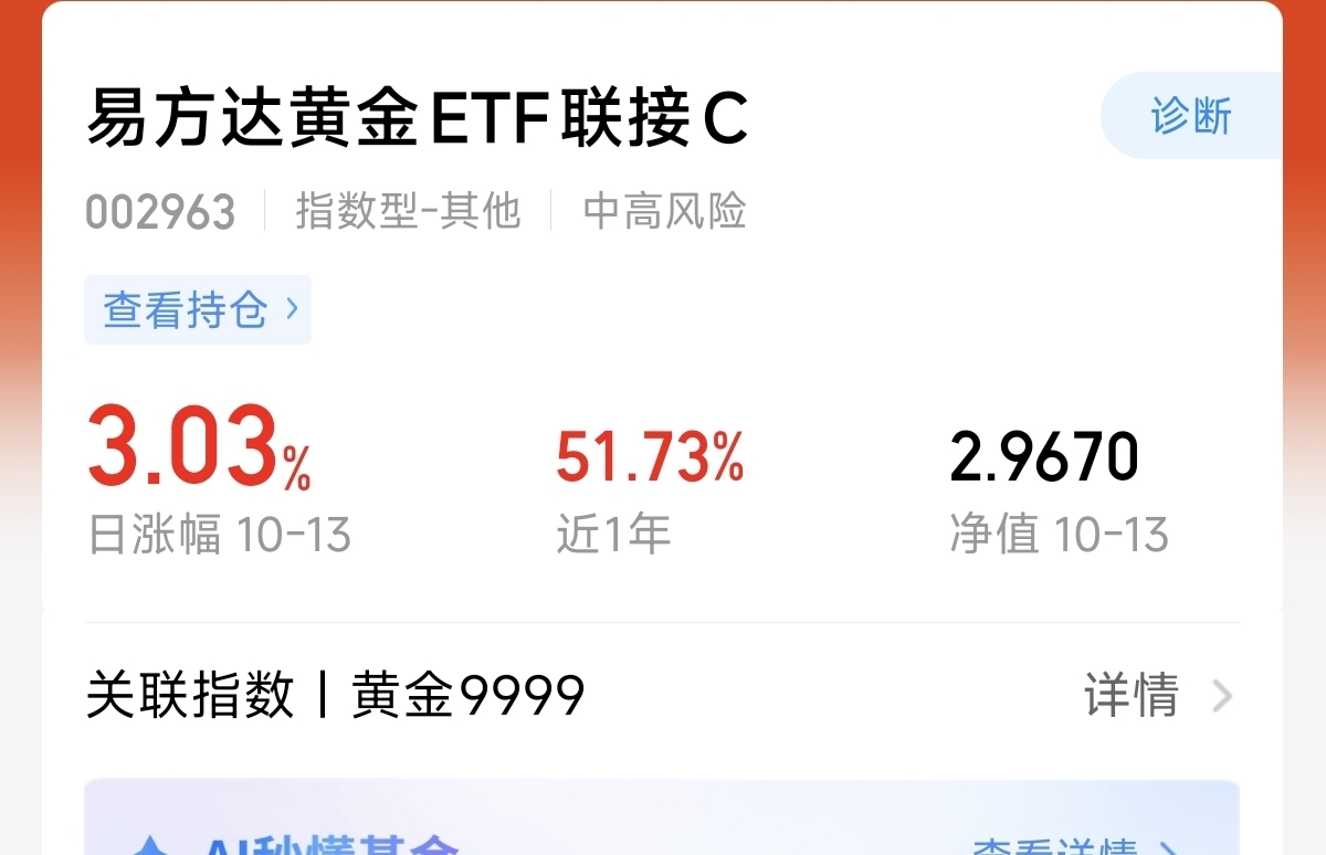 三大指数今天还是出现了回落。且昨天反弹的美股期货也出现回调。当前来看,全球不确定性依然还存在。今天表现最好的还是黄金。在美联储降息打开的节奏下,全球资金加速流入黄金。,机构纷纷看多黄金目标价,整体来看,未来的黄金上涨的空间还很大。我今天继续布局持有的$易方达黄金ETF联接C$ 紧跟黄金表现好。昨天又上涨了3.03%。近一年涨幅51.73%。同类黄金基金长期做到了优秀。看好未来继续突破。