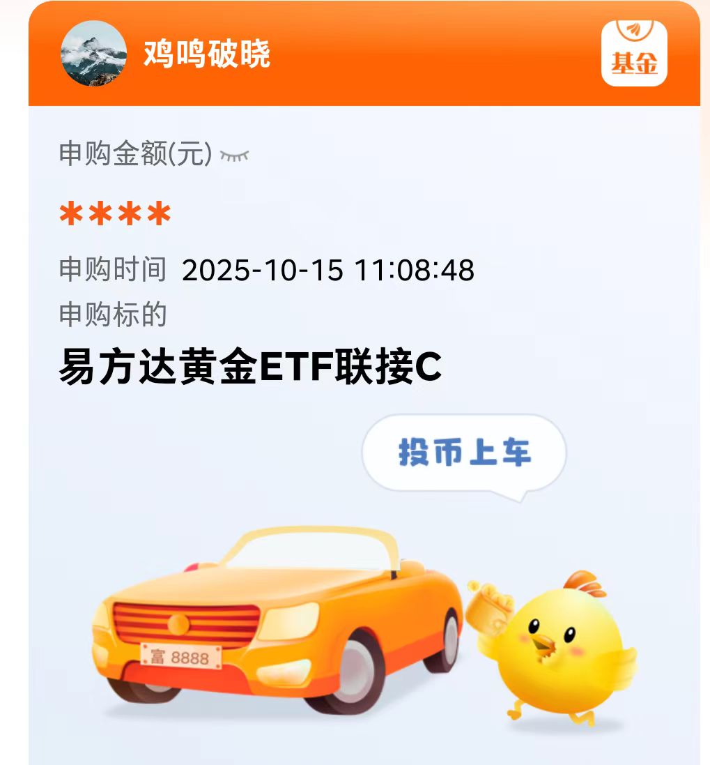 10月股市开门红后就开始震荡了,短期内中美在多个领域博弈升级,市场波动加剧;而且从中长期看,全球地缘政治风险、国际贸易摩擦登波动加剧因素持续存在;黄金行情相对独立,避险价值凸显,我继续加仓$易方达黄金ETF联接C(OTCFUND|002963)$