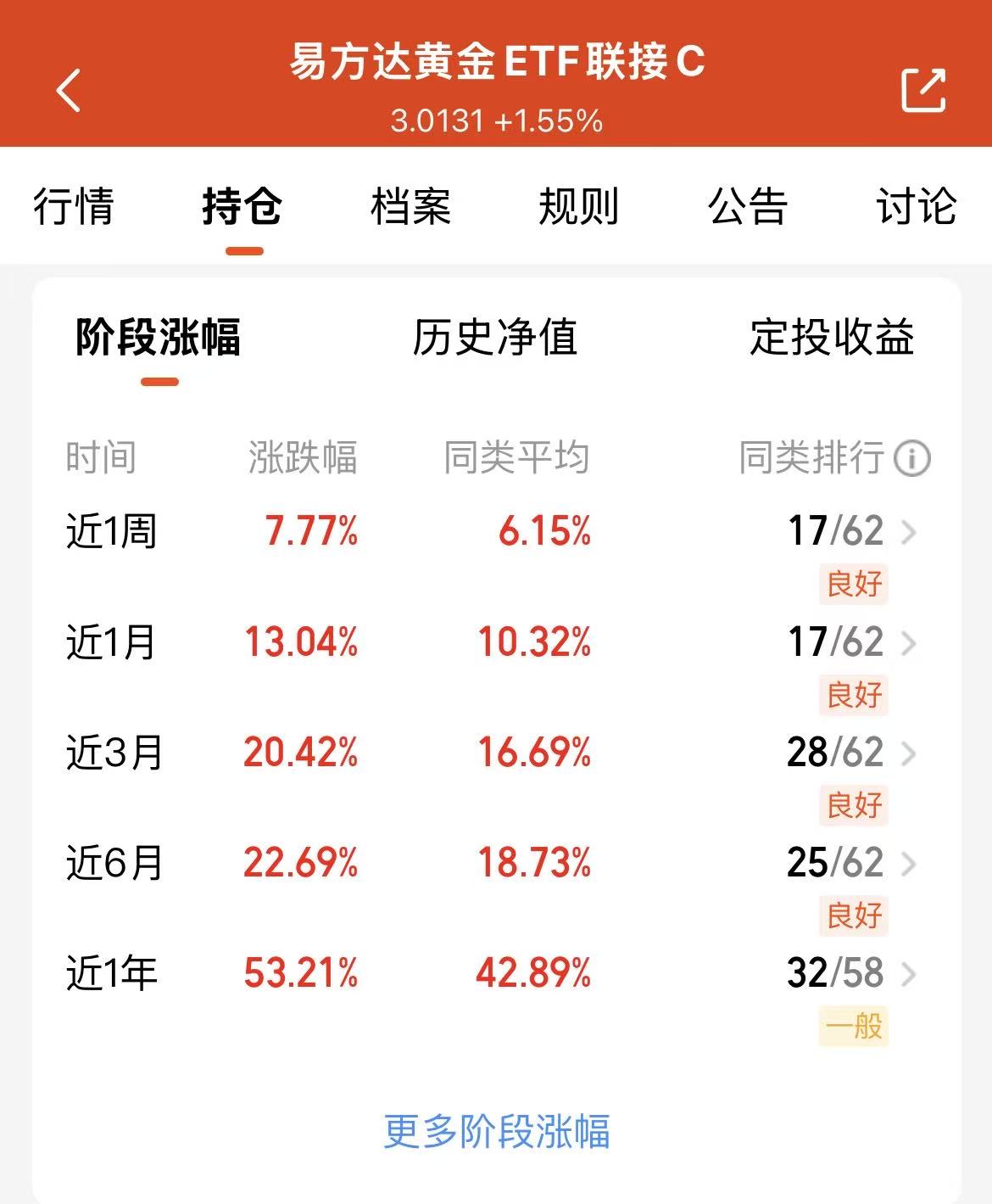最近黄金表现真是强啊,弹性大,昨天小回调后,又快速拉升起来了,而且美联储降息周期已开启,黄金还能继续看涨。$易方达黄金ETF联接C(OTCFUND|002963)$近一周涨幅7.77%,近三个月涨幅20.42%,近一年涨幅53.21%,业绩优秀,盈利强,长期持有,收获满满的,所以我也继续拿好等待更好的上涨啦!