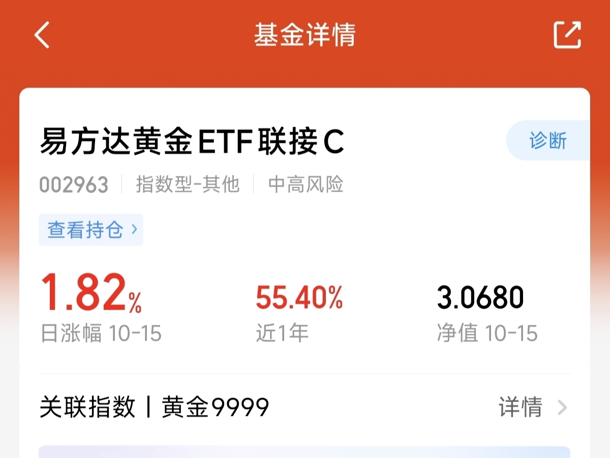 这也太给力了吧。昨夜的黄金再次创出新高。美联储10月降息继续快速升温。各大央行还在加速购金,资金目前正在加速涌入黄金。国际机构大幅上调了黄金目标价。当前来看,黄金目前上涨的空间还比较高。今天我决定继续定投持有的$易方达黄金ETF联接C$ ,紧跟黄金表现好。昨天又上涨了1.82%。近一年涨幅55.4%。同类黄金基金长期做到了优秀。目前全球市场都不太稳,还是黄金的确定性强。我还是继续定投。