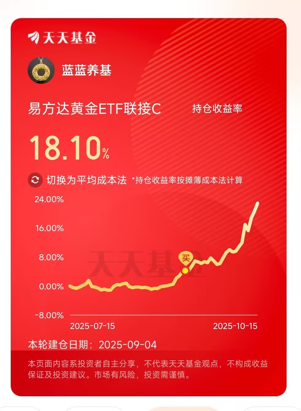 要是想搭这波黄金上涨的车,$易方达黄金ETF联接C(OTCFUND|002963)$就挺合适,直接跟住黄金行情,不想错过短期机会的话,现在手18.1%,我今日继续加仓!