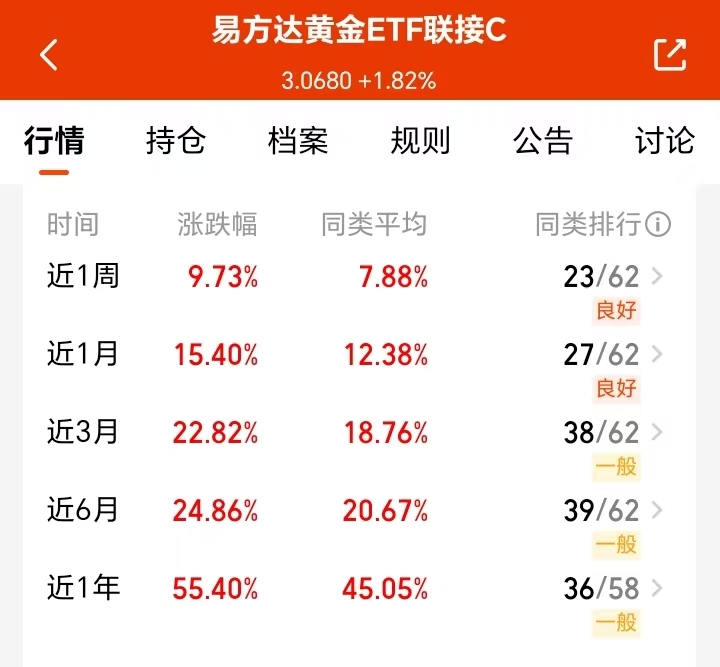 $易方达黄金ETF联接C(OTCFUND|002963)$近一周上涨9.73%,近三个月上涨22.82%,近一年上涨55.40%。业绩不错,我今天也继续顺势补仓一笔,看好黄金长期价值趋势。#黄金逼近4200美元!美银:明年5000#