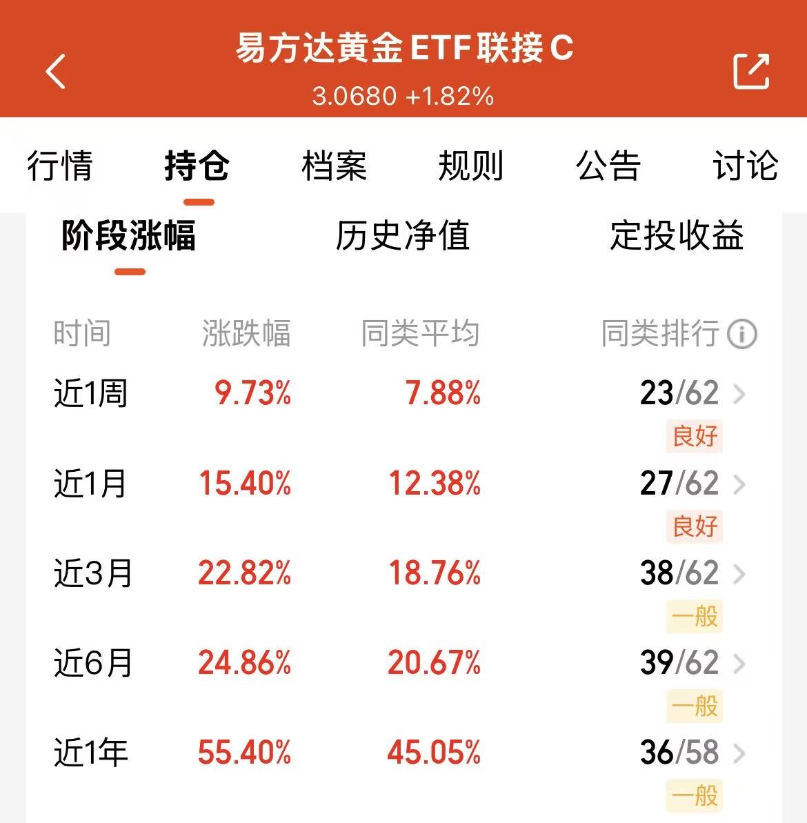 黄金又破新高啦,现货黄金已经突破4200美元/盎司了,眼下美联储在10月底还有降息预期,黄金还有很大的上涨空间。$易方达黄金ETF联接C(OTCFUND|002963)$近一个月涨幅9.73%,近一个月涨幅15.4%,近一年涨幅55.4%,业绩优秀,盈利强,我觉得短期趋势还有望延续,继续看好黄金表现!