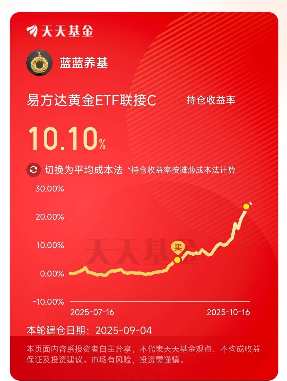 金价涨得太猛了!前天还在猜能不能破4300美元,昨天就稳稳站上4324美元,今天还在接着涨。看看我的收益,$易方达黄金ETF联接C(OTCFUND|002963)$可以看,专门跟踪黄金行情,不用自己费心选。而且C类申购0费,持有够天数还免赎回费,成本低。现在金价势头正劲,想搭车的可以多留意!