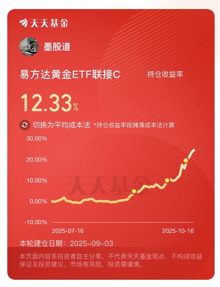 金价涨得太猛了!本周已连涨四天,近期更是五天连阳,涨幅都快赶上九月一整月的了,势头根本挡不住。想跟着布局又怕麻烦?我上车了$易方达黄金ETF联接C(OTCFUND|002963)$,专门跟踪黄金行情,不用自己挑股。而且C类申购0费,持有30天还免赎回费,成本低。现在这涨势,想搭车的可以多留意!