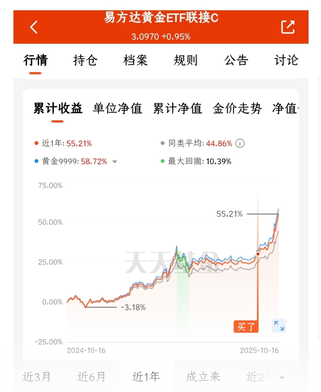 我之前买了$易方达黄金ETF联接C$,现在打算再补点仓。在市场波动大的时候,黄金往往比较抗跌,是个相对稳妥的选择。虽然不知道后面具体会怎么走,但我觉得配置点黄金还是挺有必要的,可以平衡下风险。