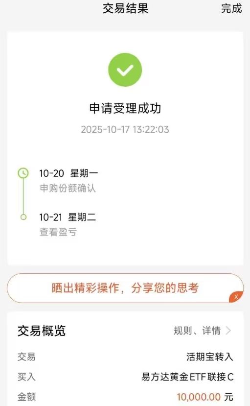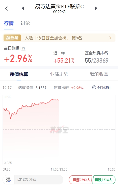 昨天尾盘我果断加仓了易方达黄金ETF联接C,这个品种跟踪标的是黄金9999,基金规模145.21亿(数据来源:天天基金6月30日),目前估值2.96%,也就是说昨天刚刚建仓,今天市场就给我一个大红包了,所以在趋势面前,最重要的是观察资金的流向,而不是实际的涨幅,别看黄金涨得这么猛,只要没有看到抛压,继续上涨就是大概率的事情,用易方达黄金ETF联接C跟踪黄金涨跌实在太方便了,我继续看好。