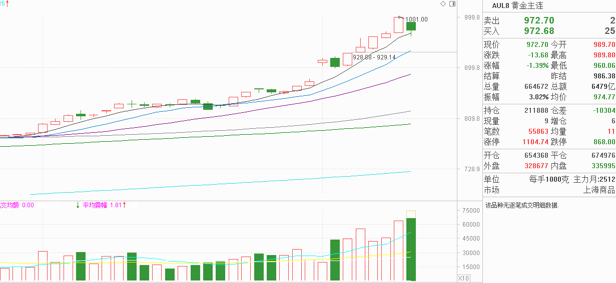 家人们,今天必须给大家好好聊聊那个永远让人又爱又恨的黄金!黄金上周五大阳反弹创新高并突破1000元大关,资金流入是清晰的,但有一点大家发现没有?本次黄金自节后启动,上周连涨5天突破新高,一直都是围绕5天线震荡上行,上周五突然加速上行,又远离了5天线,情况与10月9号大涨一样,当天都是远离了5天线,在技术上会有震荡等待5天线上移的需求。所以10月10号黄金出现高开低走,今天黄金是低开低走,性质都是一样的:等待5天线上移。今天黄金中阴调整击穿5天线后即回升,下影线依然比较长,反倒比10号回调更明确的修复了超买信号。上一周黄金资金出现大幅资金流入,出现一天甚至两天的调整都很正常。高位震荡还有一点要提示,黄金当前是买预期卖现实的逻辑,降息是现实落地不会出现进一步上行,预期还要降多少,是否超预期才是下一周期的交易逻辑,因此降息落地反而制约黄金的上涨,与9月降息一样,我觉得降息是黄金最大基本面,不太可能因为降息落地导致黄金大幅回落,通常会围绕5天线与10天线波动。对于黄金来说,确认上涨波段顺势而为才是根本。