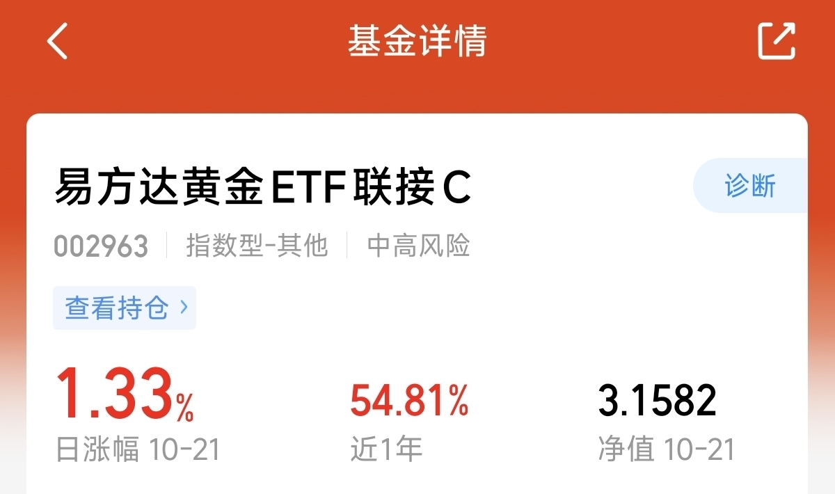 黄金突发调整,可是我依然不慌。主要是前期上涨过快,获利盘带来的影响。但是大的逻辑没有变,各大央行还在增持。全球不确定性依然没有解除。长线看好黄金未来表现。撑着回调。我继续定投$易方达黄金ETF联接C$ 紧跟黄金表现好。昨天上涨1.33%。近一年涨幅54.81%。,看好四季度黄金继续重回高位。
