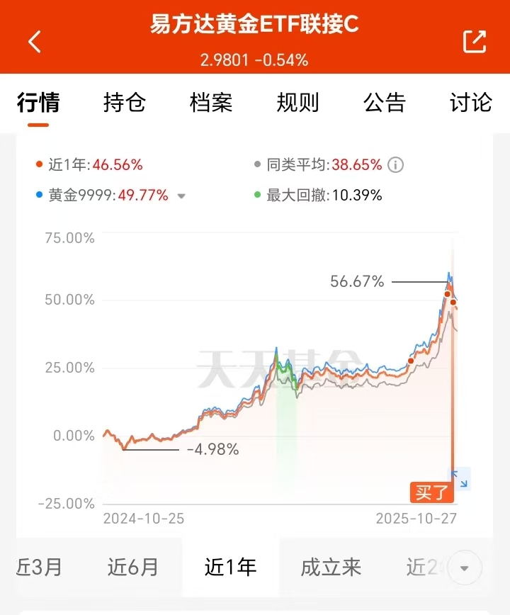 $易方达黄金ETF联接C(OTCFUND|002963)$近一年涨幅46.56%,长期业绩不错,跟着黄金长期趋势走。所以不用怕短期的回调,我也打算大跌就多买点儿,小跌就少加些,再次慢慢布局起来。#现货黄金跌破4000美元!缘何突然暴跌?#
