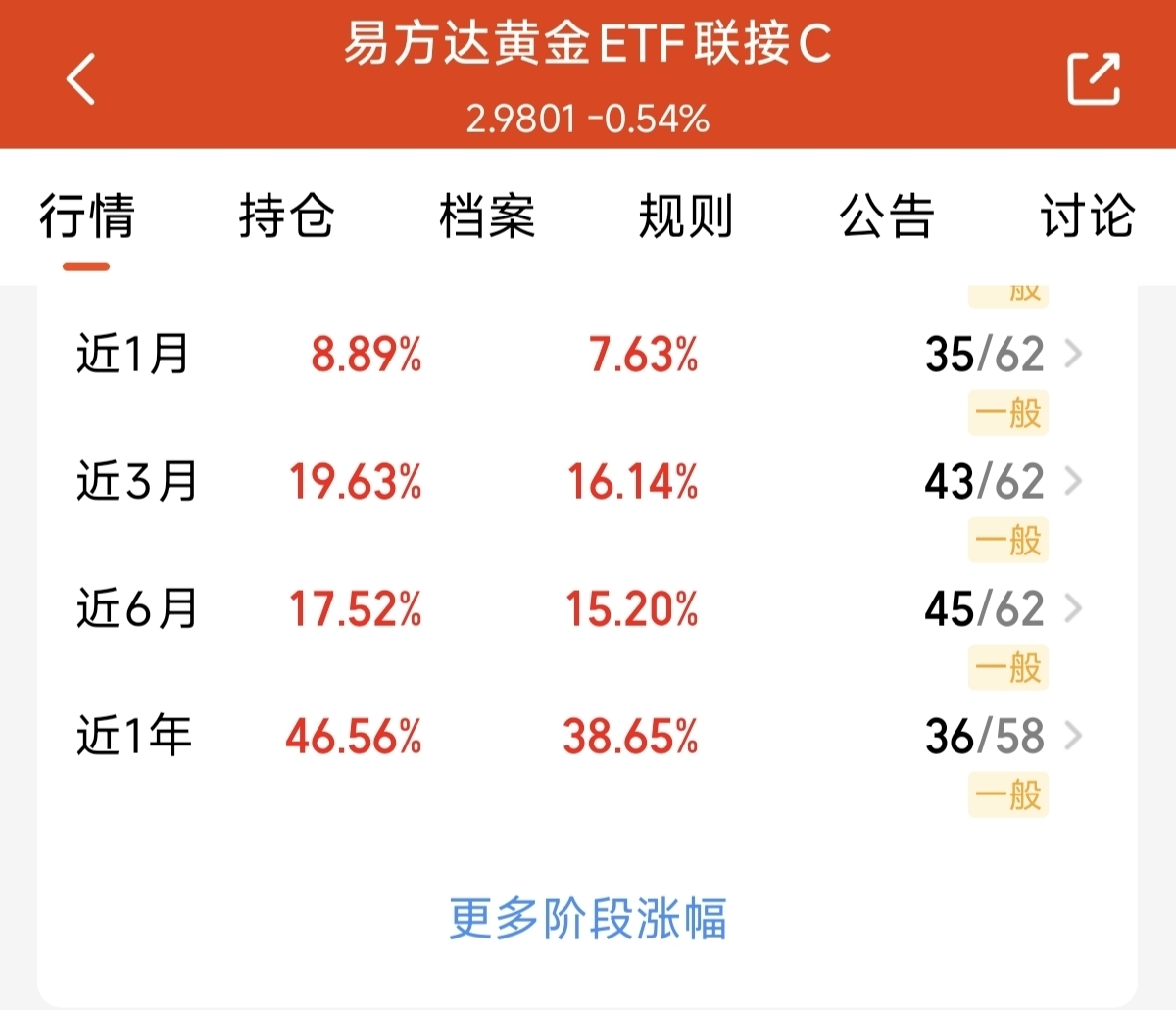 黄金调整,我依然不担心。毕竟在贸易摩擦降温的趋势下,黄金出现了连续大幅回调。可是可以看到,对比前期的涨幅来看,调整的依然不算多。而且今天黄金已经再度开启了反弹,这个位置向下调整的空间不大。本周随着美联储再度打开降息,调整的黄金有望再度迎来反弹突破。$易方达黄金ETF联接C$ 这只聚焦黄金的基金,近3月上涨19.63%。近一年上涨了46.56%。同类黄金基金业绩长期做到了优秀。而且费率同类也是比较低。长期稳定的收益能力强。