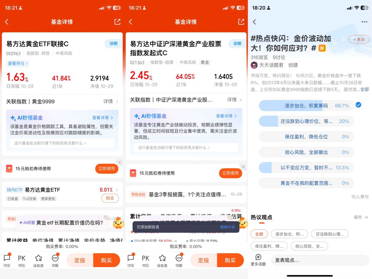 #热点快闪:金价波动加大!你如何应对?# 我选择了“逐步加仓,积累筹码”,这样选择的原因是:我非常信赖易方达基金,一直定投持有$易方达黄金ETF联接C$ 等十多个基金,获得了非常好的收益回报和持有体验!将会继续配置易方达基金产品,并长期坚定持有!