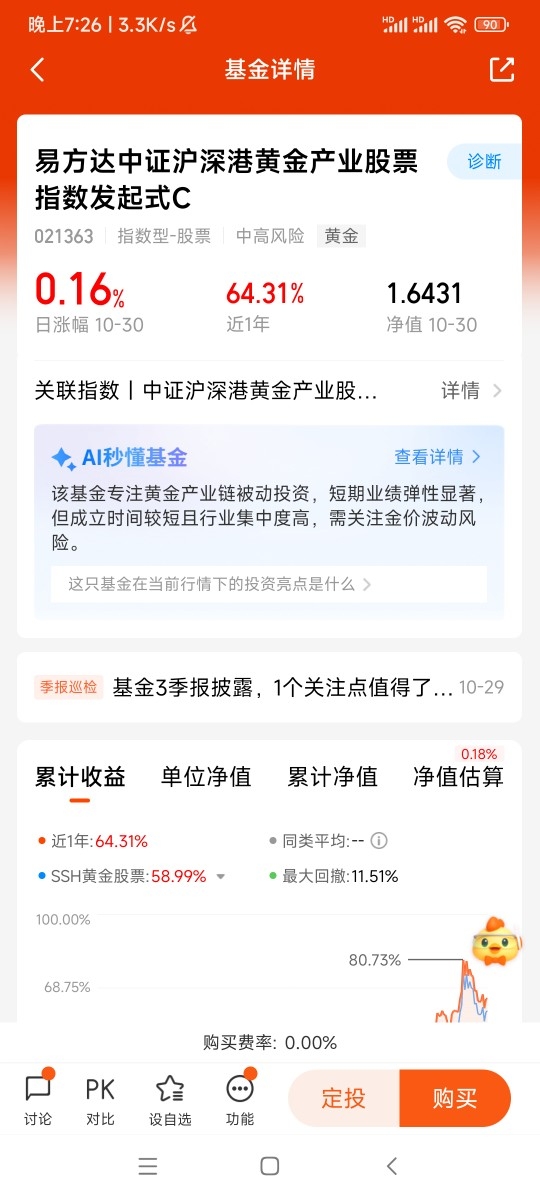 易方达黄金ETF联接C是参与黄金投资的优质工具,它能让我们便捷、高效地布局黄金资产。面对当前金价的波动,我坚信这是长期布局的机会窗口,因此会采取逐步加仓的策略,持续积累筹码。