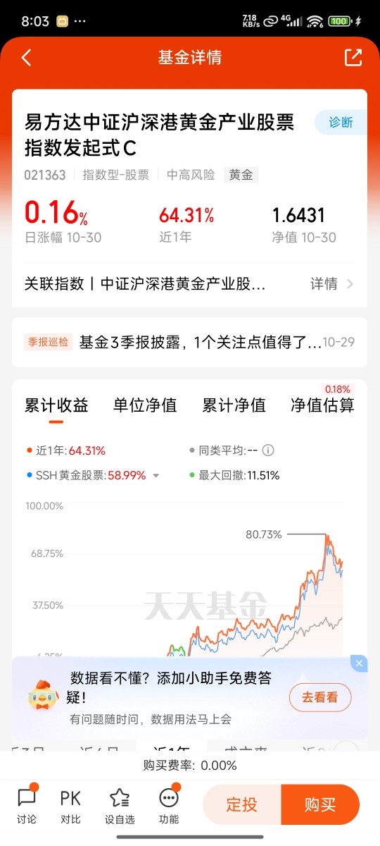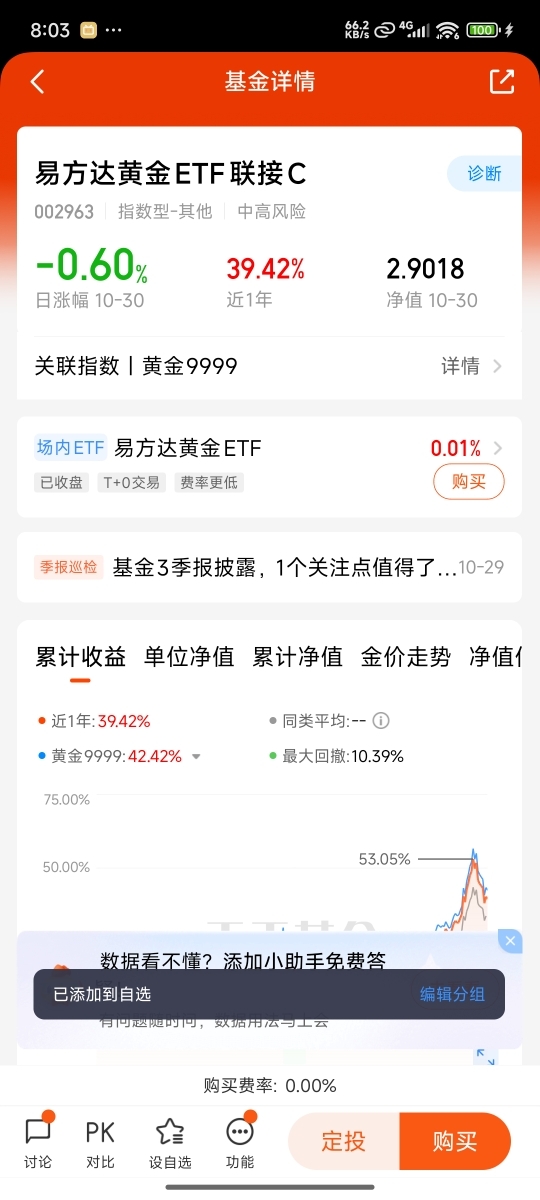 成本优势明显。该基金申购费为0,持有30天后赎回费也为0,仅收取0.50%的管理费和0.10%的托管费。相较于金饰高昂的工艺费和回收折价,黄金ETF联接基金在成本控制上更具优势。