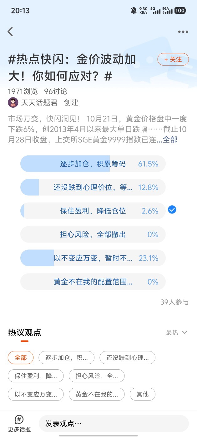 · 现金是什么?是选择权,是子弹。 当金价这么乱跳之后,万一跳着跳着,跳出一个特别便宜的“黄金坑”,那时候,手里握着现金的人才是大爷!才有资格去抄底,去买便宜货。