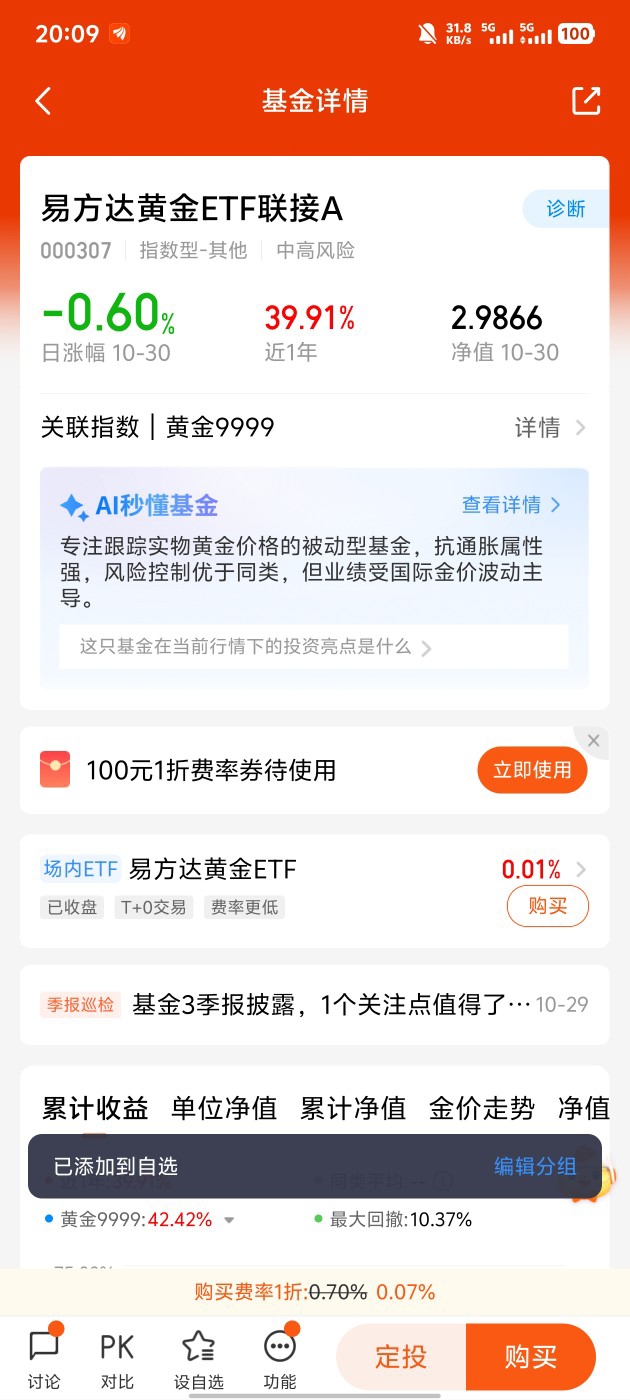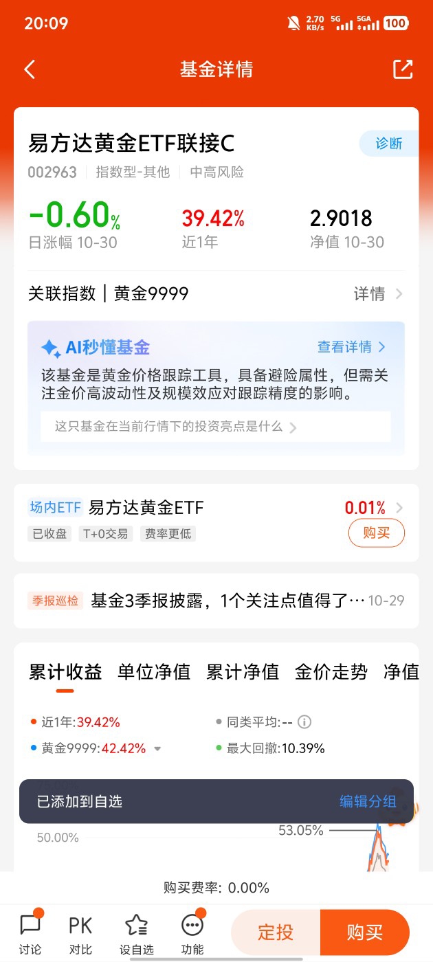 下一步我准备在合适的时间继续加投$易方达黄金ETF联接C$