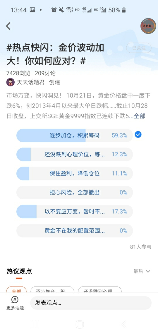 我在#热点快闪:金价波动加大!你如何应对?# 选择了“逐步加仓,积累筹码” 。