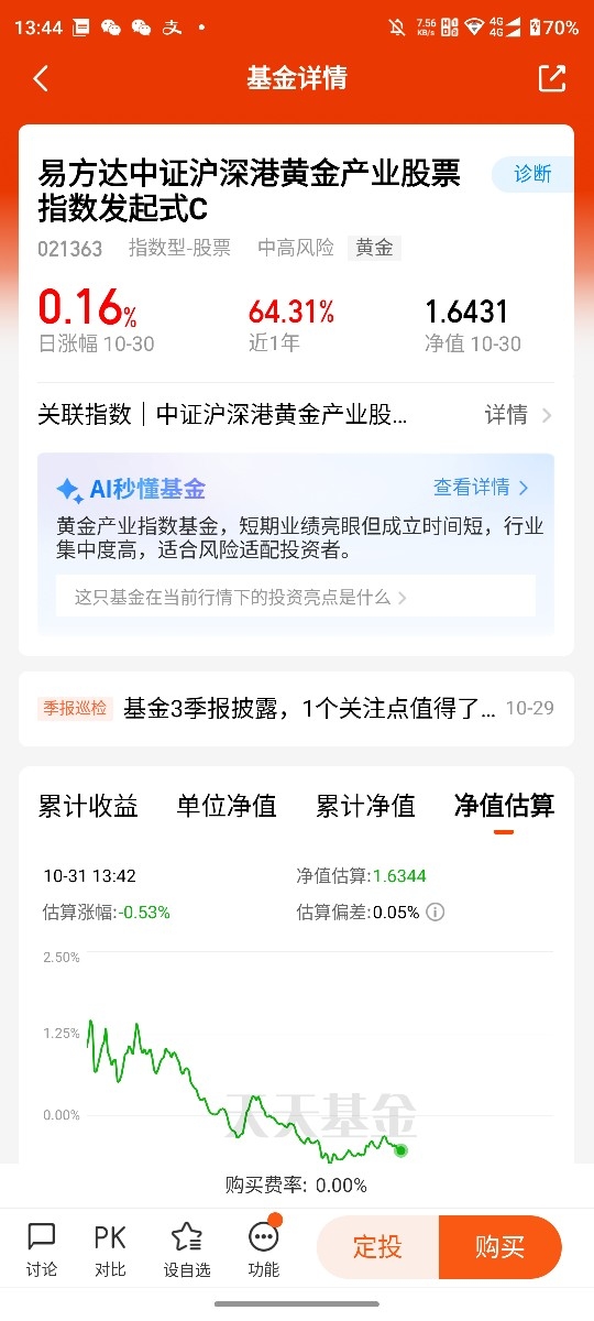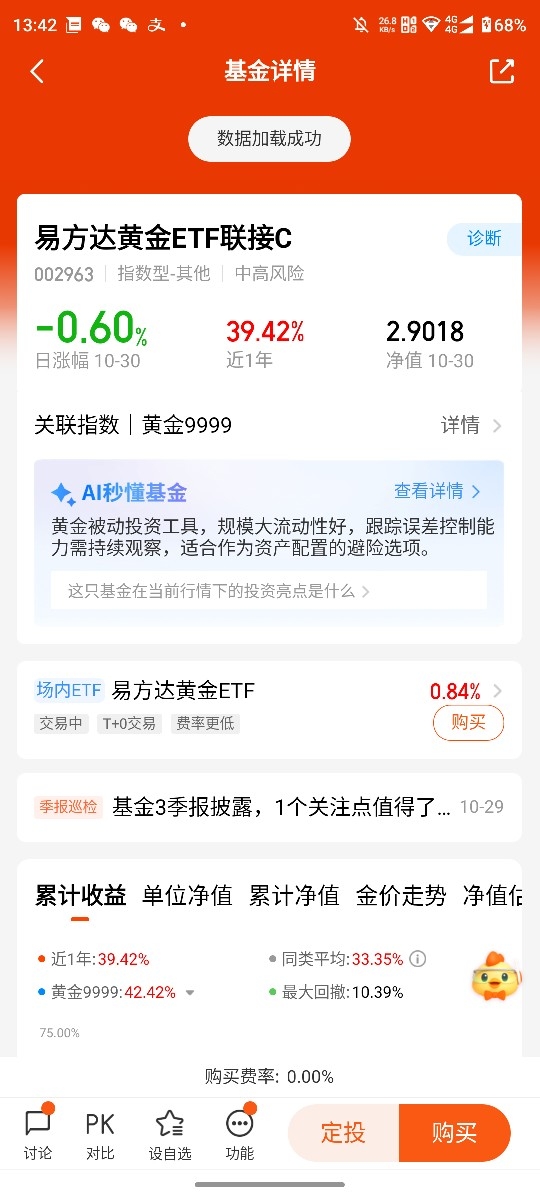 其次,逐步加仓是应对震荡的“缓冲器”。没人能精准预判最低点,一次性投入易因短期回调陷入被动。而分批买入能自动实现“高位少买、低位多买”,就像每月攒金豆豆,时间长了自然摊平成本。结合易方达黄金ETF联接C的费率优势,零申购费且持有30天免赎回费 ,小额多次加仓的交易成本极低。