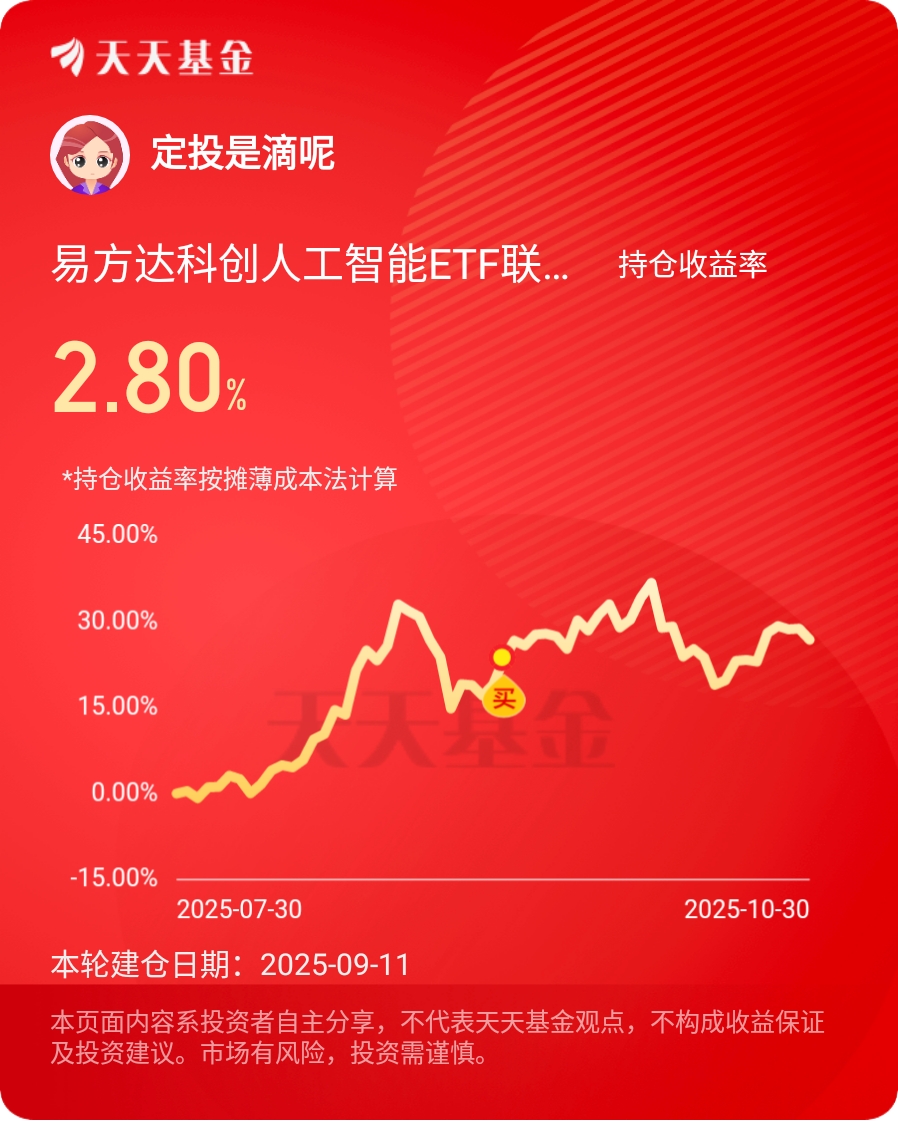 投资这事儿急不来,尤其面对金价波动,逐步加仓就是用纪律性操作对抗贪心和恐慌,慢慢攒筹码,等着时间给结果就行。@易方达基金 $易方达黄金ETF联接C$